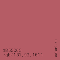 Цвет #B55C65 в цветовой модели RGB обозначается тремя октетами (181, 92, 101) в десятичном формате и #B55C65 в шестнадцатиричном (hex) формате, которые являются интенсивностью красного 181 (hex B5), интенсивность зелёного 92 (hex 5C) и интенсивность синего 101 (hex 65).