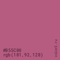 Цвет #B55C80 в цветовой модели RGB обозначается тремя октетами (181, 92, 128) в десятичном формате и #B55C80 в шестнадцатиричном (hex) формате, которые являются интенсивностью красного 181 (hex B5), интенсивность зелёного 92 (hex 5C) и интенсивность синего 128 (hex 80).