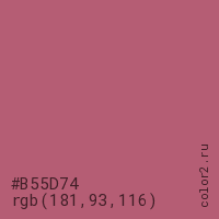 Цвет #B55D74 в цветовой модели RGB обозначается тремя октетами (181, 93, 116) в десятичном формате и #B55D74 в шестнадцатиричном (hex) формате, которые являются интенсивностью красного 181 (hex B5), интенсивность зелёного 93 (hex 5D) и интенсивность синего 116 (hex 74).