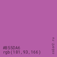 Цвет #B55DA6 в цветовой модели RGB обозначается тремя октетами (181, 93, 166) в десятичном формате и #B55DA6 в шестнадцатиричном (hex) формате, которые являются интенсивностью красного 181 (hex B5), интенсивность зелёного 93 (hex 5D) и интенсивность синего 166 (hex A6).