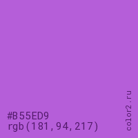 Цвет #B55ED9 в цветовой модели RGB обозначается тремя октетами (181, 94, 217) в десятичном формате и #B55ED9 в шестнадцатиричном (hex) формате, которые являются интенсивностью красного 181 (hex B5), интенсивность зелёного 94 (hex 5E) и интенсивность синего 217 (hex D9).