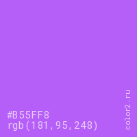 Цвет #B55FF8 в цветовой модели RGB обозначается тремя октетами (181, 95, 248) в десятичном формате и #B55FF8 в шестнадцатиричном (hex) формате, которые являются интенсивностью красного 181 (hex B5), интенсивность зелёного 95 (hex 5F) и интенсивность синего 248 (hex F8).