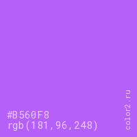 Цвет #B560F8 в цветовой модели RGB обозначается тремя октетами (181, 96, 248) в десятичном формате и #B560F8 в шестнадцатиричном (hex) формате, которые являются интенсивностью красного 181 (hex B5), интенсивность зелёного 96 (hex 60) и интенсивность синего 248 (hex F8).
