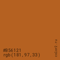 Цвет #B56121 в цветовой модели RGB обозначается тремя октетами (181, 97, 33) в десятичном формате и #B56121 в шестнадцатиричном (hex) формате, которые являются интенсивностью красного 181 (hex B5), интенсивность зелёного 97 (hex 61) и интенсивность синего 33 (hex 21).