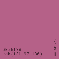 Цвет #B56188 в цветовой модели RGB обозначается тремя октетами (181, 97, 136) в десятичном формате и #B56188 в шестнадцатиричном (hex) формате, которые являются интенсивностью красного 181 (hex B5), интенсивность зелёного 97 (hex 61) и интенсивность синего 136 (hex 88).