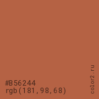 Цвет #B56244 в цветовой модели RGB обозначается тремя октетами (181, 98, 68) в десятичном формате и #B56244 в шестнадцатиричном (hex) формате, которые являются интенсивностью красного 181 (hex B5), интенсивность зелёного 98 (hex 62) и интенсивность синего 68 (hex 44).