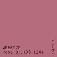 Цвет #B56C7C в цветовой модели RGB обозначается тремя октетами (181, 108, 124) в десятичном формате и #B56C7C в шестнадцатиричном (hex) формате, которые являются интенсивностью красного 181 (hex B5), интенсивность зелёного 108 (hex 6C) и интенсивность синего 124 (hex 7C).