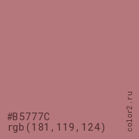 Цвет #B5777C в цветовой модели RGB обозначается тремя октетами (181, 119, 124) в десятичном формате и #B5777C в шестнадцатиричном (hex) формате, которые являются интенсивностью красного 181 (hex B5), интенсивность зелёного 119 (hex 77) и интенсивность синего 124 (hex 7C).