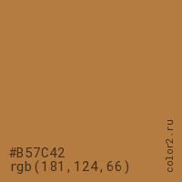 Цвет #B57C42 в цветовой модели RGB обозначается тремя октетами (181, 124, 66) в десятичном формате и #B57C42 в шестнадцатиричном (hex) формате, которые являются интенсивностью красного 181 (hex B5), интенсивность зелёного 124 (hex 7C) и интенсивность синего 66 (hex 42).