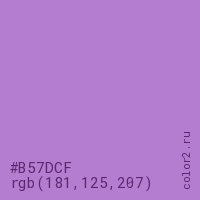 Цвет #B57DCF в цветовой модели RGB обозначается тремя октетами (181, 125, 207) в десятичном формате и #B57DCF в шестнадцатиричном (hex) формате, которые являются интенсивностью красного 181 (hex B5), интенсивность зелёного 125 (hex 7D) и интенсивность синего 207 (hex CF).
