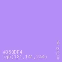 Цвет #B58DF4 в цветовой модели RGB обозначается тремя октетами (181, 141, 244) в десятичном формате и #B58DF4 в шестнадцатиричном (hex) формате, которые являются интенсивностью красного 181 (hex B5), интенсивность зелёного 141 (hex 8D) и интенсивность синего 244 (hex F4).