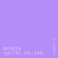 Цвет #B58DF8 в цветовой модели RGB обозначается тремя октетами (181, 141, 248) в десятичном формате и #B58DF8 в шестнадцатиричном (hex) формате, которые являются интенсивностью красного 181 (hex B5), интенсивность зелёного 141 (hex 8D) и интенсивность синего 248 (hex F8).