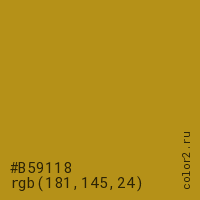 Цвет #B59118 в цветовой модели RGB обозначается тремя октетами (181, 145, 24) в десятичном формате и #B59118 в шестнадцатиричном (hex) формате, которые являются интенсивностью красного 181 (hex B5), интенсивность зелёного 145 (hex 91) и интенсивность синего 24 (hex 18).