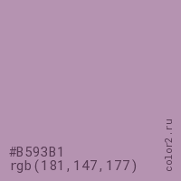 Цвет #B593B1 в цветовой модели RGB обозначается тремя октетами (181, 147, 177) в десятичном формате и #B593B1 в шестнадцатиричном (hex) формате, которые являются интенсивностью красного 181 (hex B5), интенсивность зелёного 147 (hex 93) и интенсивность синего 177 (hex B1).