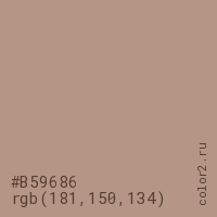 Цвет #B59686 в цветовой модели RGB обозначается тремя октетами (181, 150, 134) в десятичном формате и #B59686 в шестнадцатиричном (hex) формате, которые являются интенсивностью красного 181 (hex B5), интенсивность зелёного 150 (hex 96) и интенсивность синего 134 (hex 86).