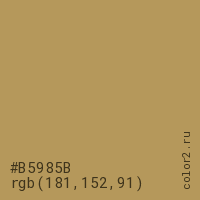 Цвет #B5985B в цветовой модели RGB обозначается тремя октетами (181, 152, 91) в десятичном формате и #B5985B в шестнадцатиричном (hex) формате, которые являются интенсивностью красного 181 (hex B5), интенсивность зелёного 152 (hex 98) и интенсивность синего 91 (hex 5B).