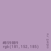 Цвет #B598B9 в цветовой модели RGB обозначается тремя октетами (181, 152, 185) в десятичном формате и #B598B9 в шестнадцатиричном (hex) формате, которые являются интенсивностью красного 181 (hex B5), интенсивность зелёного 152 (hex 98) и интенсивность синего 185 (hex B9).