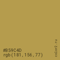 Цвет #B59C4D в цветовой модели RGB обозначается тремя октетами (181, 156, 77) в десятичном формате и #B59C4D в шестнадцатиричном (hex) формате, которые являются интенсивностью красного 181 (hex B5), интенсивность зелёного 156 (hex 9C) и интенсивность синего 77 (hex 4D).
