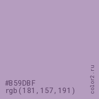 Цвет #B59DBF в цветовой модели RGB обозначается тремя октетами (181, 157, 191) в десятичном формате и #B59DBF в шестнадцатиричном (hex) формате, которые являются интенсивностью красного 181 (hex B5), интенсивность зелёного 157 (hex 9D) и интенсивность синего 191 (hex BF).