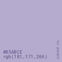 Цвет #B5ABCE в цветовой модели RGB обозначается тремя октетами (181, 171, 206) в десятичном формате и #B5ABCE в шестнадцатиричном (hex) формате, которые являются интенсивностью красного 181 (hex B5), интенсивность зелёного 171 (hex AB) и интенсивность синего 206 (hex CE).