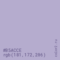 Цвет #B5ACCE в цветовой модели RGB обозначается тремя октетами (181, 172, 206) в десятичном формате и #B5ACCE в шестнадцатиричном (hex) формате, которые являются интенсивностью красного 181 (hex B5), интенсивность зелёного 172 (hex AC) и интенсивность синего 206 (hex CE).