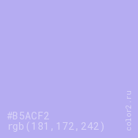 Цвет #B5ACF2 в цветовой модели RGB обозначается тремя октетами (181, 172, 242) в десятичном формате и #B5ACF2 в шестнадцатиричном (hex) формате, которые являются интенсивностью красного 181 (hex B5), интенсивность зелёного 172 (hex AC) и интенсивность синего 242 (hex F2).