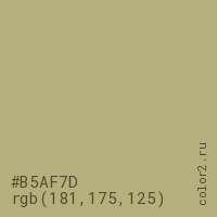 Цвет #B5AF7D в цветовой модели RGB обозначается тремя октетами (181, 175, 125) в десятичном формате и #B5AF7D в шестнадцатиричном (hex) формате, которые являются интенсивностью красного 181 (hex B5), интенсивность зелёного 175 (hex AF) и интенсивность синего 125 (hex 7D).