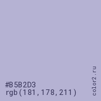 Цвет #B5B2D3 в цветовой модели RGB обозначается тремя октетами (181, 178, 211) в десятичном формате и #B5B2D3 в шестнадцатиричном (hex) формате, которые являются интенсивностью красного 181 (hex B5), интенсивность зелёного 178 (hex B2) и интенсивность синего 211 (hex D3).