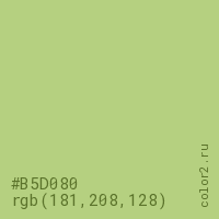 Цвет #B5D080 в цветовой модели RGB обозначается тремя октетами (181, 208, 128) в десятичном формате и #B5D080 в шестнадцатиричном (hex) формате, которые являются интенсивностью красного 181 (hex B5), интенсивность зелёного 208 (hex D0) и интенсивность синего 128 (hex 80).