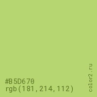 Цвет #B5D670 в цветовой модели RGB обозначается тремя октетами (181, 214, 112) в десятичном формате и #B5D670 в шестнадцатиричном (hex) формате, которые являются интенсивностью красного 181 (hex B5), интенсивность зелёного 214 (hex D6) и интенсивность синего 112 (hex 70).