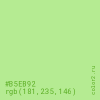 Цвет #B5EB92 в цветовой модели RGB обозначается тремя октетами (181, 235, 146) в десятичном формате и #B5EB92 в шестнадцатиричном (hex) формате, которые являются интенсивностью красного 181 (hex B5), интенсивность зелёного 235 (hex EB) и интенсивность синего 146 (hex 92).