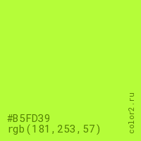 Цвет #B5FD39 в цветовой модели RGB обозначается тремя октетами (181, 253, 57) в десятичном формате и #B5FD39 в шестнадцатиричном (hex) формате, которые являются интенсивностью красного 181 (hex B5), интенсивность зелёного 253 (hex FD) и интенсивность синего 57 (hex 39).