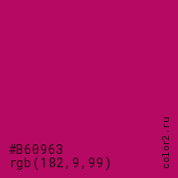 Цвет #B60963 в цветовой модели RGB обозначается тремя октетами (182, 9, 99) в десятичном формате и #B60963 в шестнадцатиричном (hex) формате, которые являются интенсивностью красного 182 (hex B6), интенсивность зелёного 9 (hex 09) и интенсивность синего 99 (hex 63).