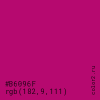 Цвет #B6096F в цветовой модели RGB обозначается тремя октетами (182, 9, 111) в десятичном формате и #B6096F в шестнадцатиричном (hex) формате, которые являются интенсивностью красного 182 (hex B6), интенсивность зелёного 9 (hex 09) и интенсивность синего 111 (hex 6F).
