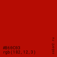 Цвет #B60C03 в цветовой модели RGB обозначается тремя октетами (182, 12, 3) в десятичном формате и #B60C03 в шестнадцатиричном (hex) формате, которые являются интенсивностью красного 182 (hex B6), интенсивность зелёного 12 (hex 0C) и интенсивность синего 3 (hex 03).