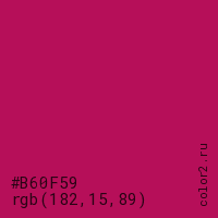 Цвет #B60F59 в цветовой модели RGB обозначается тремя октетами (182, 15, 89) в десятичном формате и #B60F59 в шестнадцатиричном (hex) формате, которые являются интенсивностью красного 182 (hex B6), интенсивность зелёного 15 (hex 0F) и интенсивность синего 89 (hex 59).