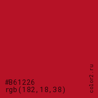 Цвет #B61226 в цветовой модели RGB обозначается тремя октетами (182, 18, 38) в десятичном формате и #B61226 в шестнадцатиричном (hex) формате, которые являются интенсивностью красного 182 (hex B6), интенсивность зелёного 18 (hex 12) и интенсивность синего 38 (hex 26).