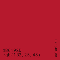 Цвет #B6192D в цветовой модели RGB обозначается тремя октетами (182, 25, 45) в десятичном формате и #B6192D в шестнадцатиричном (hex) формате, которые являются интенсивностью красного 182 (hex B6), интенсивность зелёного 25 (hex 19) и интенсивность синего 45 (hex 2D).