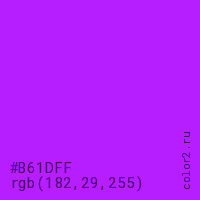 Цвет #B61DFF в цветовой модели RGB обозначается тремя октетами (182, 29, 255) в десятичном формате и #B61DFF в шестнадцатиричном (hex) формате, которые являются интенсивностью красного 182 (hex B6), интенсивность зелёного 29 (hex 1D) и интенсивность синего 255 (hex FF).