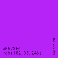 Цвет #B623F6 в цветовой модели RGB обозначается тремя октетами (182, 35, 246) в десятичном формате и #B623F6 в шестнадцатиричном (hex) формате, которые являются интенсивностью красного 182 (hex B6), интенсивность зелёного 35 (hex 23) и интенсивность синего 246 (hex F6).
