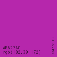 Цвет #B627AC в цветовой модели RGB обозначается тремя октетами (182, 39, 172) в десятичном формате и #B627AC в шестнадцатиричном (hex) формате, которые являются интенсивностью красного 182 (hex B6), интенсивность зелёного 39 (hex 27) и интенсивность синего 172 (hex AC).