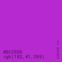 Цвет #B629D0 в цветовой модели RGB обозначается тремя октетами (182, 41, 208) в десятичном формате и #B629D0 в шестнадцатиричном (hex) формате, которые являются интенсивностью красного 182 (hex B6), интенсивность зелёного 41 (hex 29) и интенсивность синего 208 (hex D0).