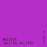 Цвет #B62CC6 в цветовой модели RGB обозначается тремя октетами (182, 44, 198) в десятичном формате и #B62CC6 в шестнадцатиричном (hex) формате, которые являются интенсивностью красного 182 (hex B6), интенсивность зелёного 44 (hex 2C) и интенсивность синего 198 (hex C6).