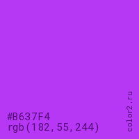 Цвет #B637F4 в цветовой модели RGB обозначается тремя октетами (182, 55, 244) в десятичном формате и #B637F4 в шестнадцатиричном (hex) формате, которые являются интенсивностью красного 182 (hex B6), интенсивность зелёного 55 (hex 37) и интенсивность синего 244 (hex F4).