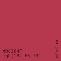 Цвет #B6384F в цветовой модели RGB обозначается тремя октетами (182, 56, 79) в десятичном формате и #B6384F в шестнадцатиричном (hex) формате, которые являются интенсивностью красного 182 (hex B6), интенсивность зелёного 56 (hex 38) и интенсивность синего 79 (hex 4F).