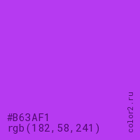 Цвет #B63AF1 в цветовой модели RGB обозначается тремя октетами (182, 58, 241) в десятичном формате и #B63AF1 в шестнадцатиричном (hex) формате, которые являются интенсивностью красного 182 (hex B6), интенсивность зелёного 58 (hex 3A) и интенсивность синего 241 (hex F1).