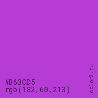 Цвет #B63CD5 в цветовой модели RGB обозначается тремя октетами (182, 60, 213) в десятичном формате и #B63CD5 в шестнадцатиричном (hex) формате, которые являются интенсивностью красного 182 (hex B6), интенсивность зелёного 60 (hex 3C) и интенсивность синего 213 (hex D5).