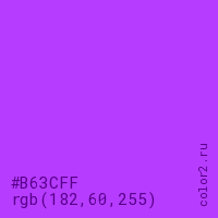Цвет #B63CFF в цветовой модели RGB обозначается тремя октетами (182, 60, 255) в десятичном формате и #B63CFF в шестнадцатиричном (hex) формате, которые являются интенсивностью красного 182 (hex B6), интенсивность зелёного 60 (hex 3C) и интенсивность синего 255 (hex FF).