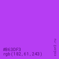 Цвет #B63DF3 в цветовой модели RGB обозначается тремя октетами (182, 61, 243) в десятичном формате и #B63DF3 в шестнадцатиричном (hex) формате, которые являются интенсивностью красного 182 (hex B6), интенсивность зелёного 61 (hex 3D) и интенсивность синего 243 (hex F3).