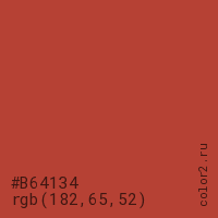Цвет #B64134 в цветовой модели RGB обозначается тремя октетами (182, 65, 52) в десятичном формате и #B64134 в шестнадцатиричном (hex) формате, которые являются интенсивностью красного 182 (hex B6), интенсивность зелёного 65 (hex 41) и интенсивность синего 52 (hex 34).
